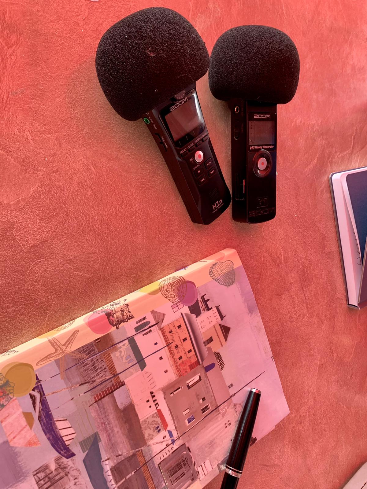We met at a café on Southend sea front in May, armed with notepads, two microphones and our mobile phones. What was recorded on the microphones was a lot of dramatic windswept noise. Really, that’s all you can hear! What we were actually talking about was how when you’re writing, you may start with one idea, then it will evolve into something else, because our best laid plans of what we were going to do were disrupted by the weather, so we had to be imaginative and do it a different way.